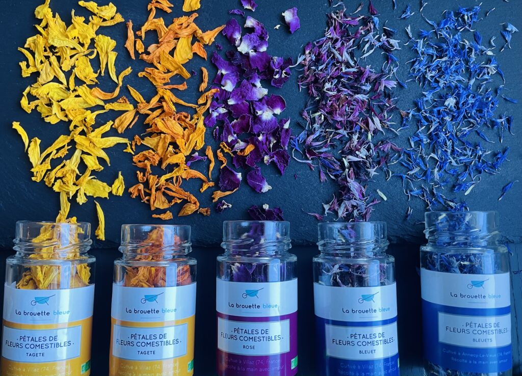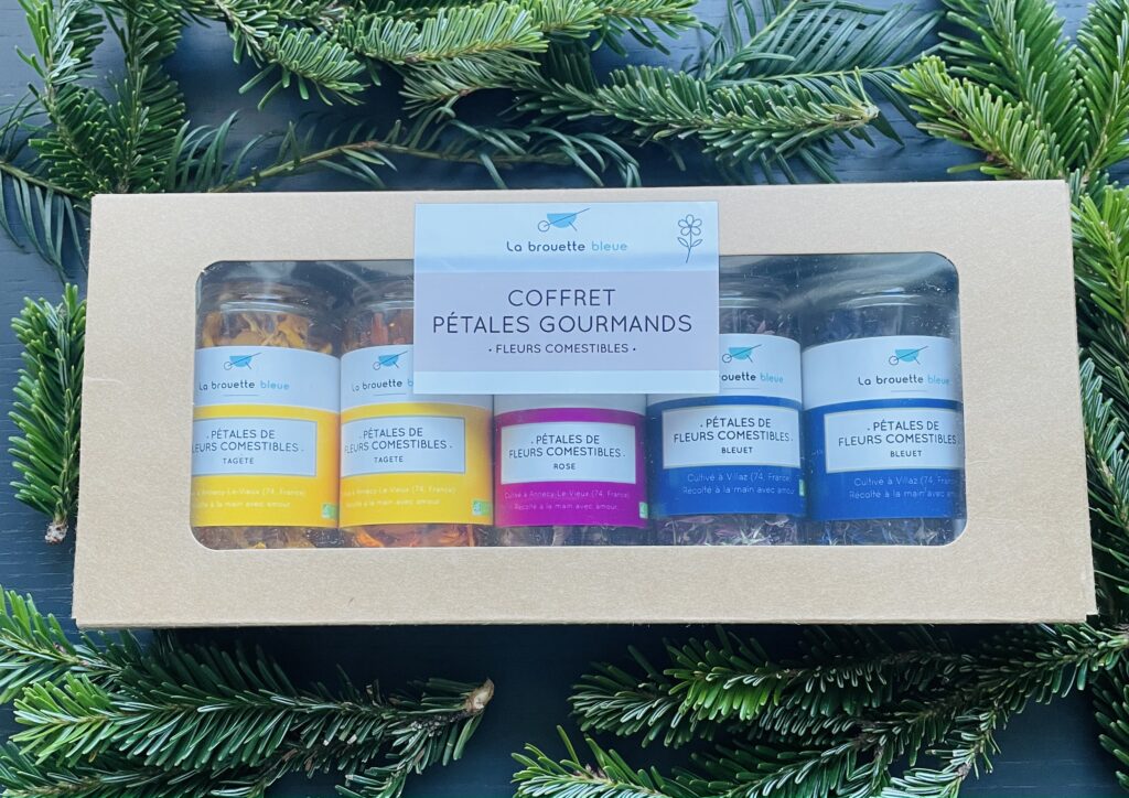 Coffrets cadeaux Des coffrets de fleurs comestibles artisanales à offrir pour sublimer les plats Coffrets cadeaux à offrir Une approche paysanne C’est en Haute-Savoie que je cultive 7000 m2 de fleurs comestibles, fleurs coupées et plantes aromatiques & médicinales.Un travail d’observation et d’attention pour le plus grand respect du végétal. Les récoltes se font à la main. Le jardin Les fleurs fraîches Les fleurs fraîches comestibles sont réservées uniquement aux professionnels des métiers de bouche.Les fleurs coupées sont réservées uniquement aux professionnels également.En revanche, la gamme séchée est accessible aux particuliers : Je découvre la gamme séchée Envie de suivre le projet ? Abonne-toi à la lettre d’info Prénom Email* Ils nous soutiennent :