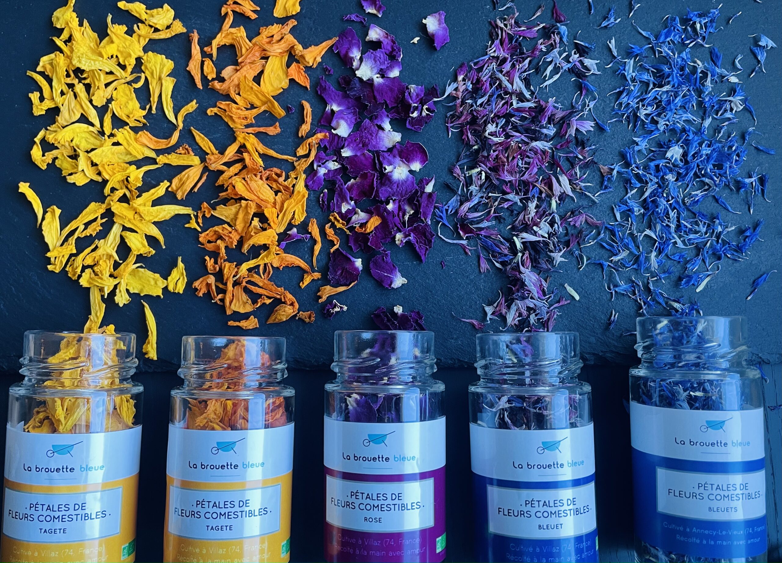- 5 pots de pétales de fleurs comestibles séchés: rose, bleuet, bleuet coloré, tagete jaune et tagete orange